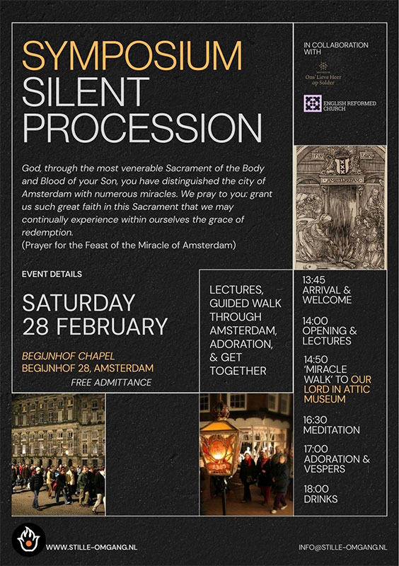 Het Gezelschap van de Stille Omgang en de Sacramentijnen houden op zaterdag 28 februari een symposium over het Mirakel van Amsterdam van 14.00 tot 17.00 uur in de Amsterdamse Begijnhofkapel.